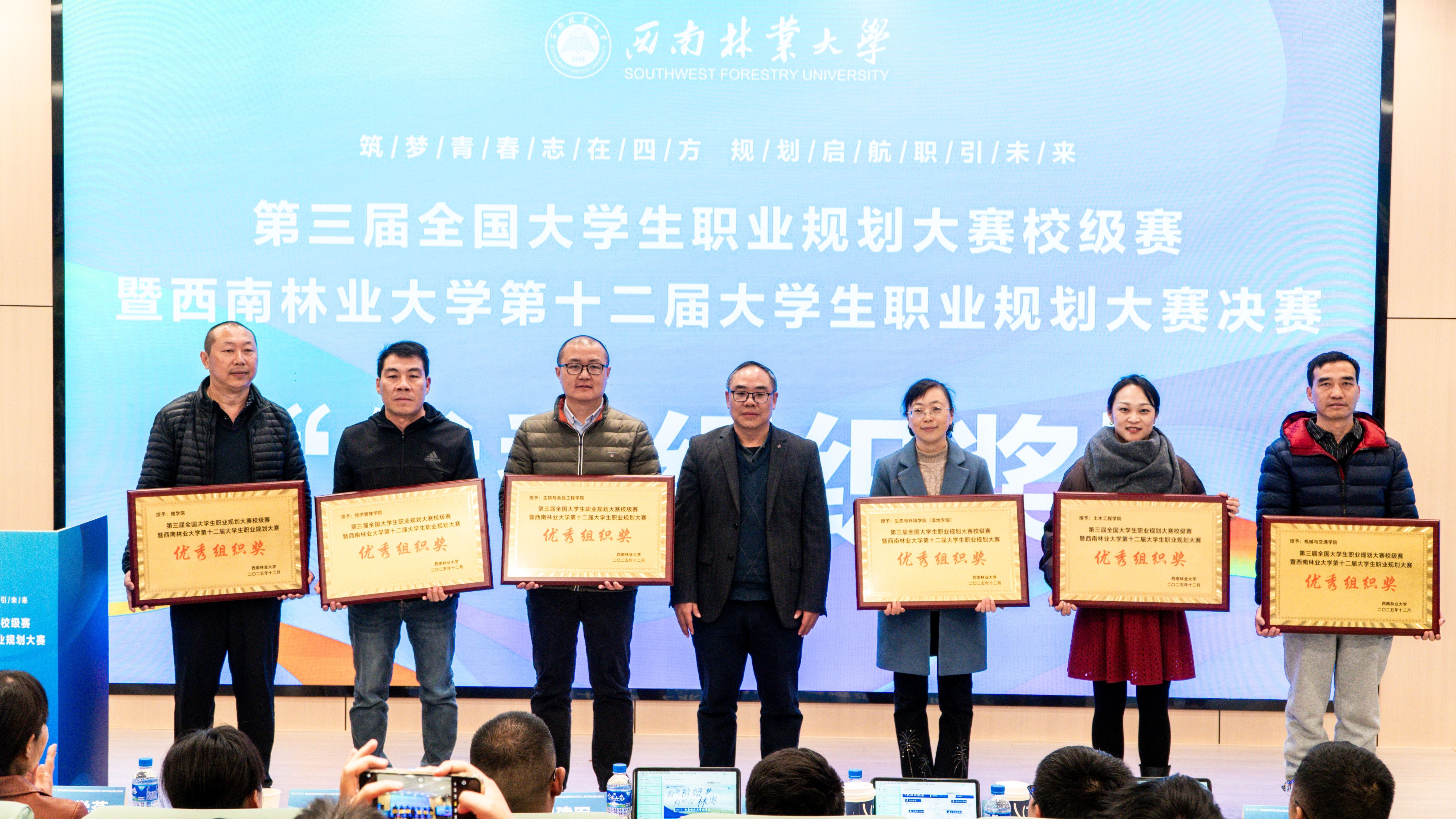 12月12日,第三届全国大学生职业规划大赛校级赛暨西南林业大学第十二届大学生职业规划大赛校级决赛在学校成功举办。大赛由就业工作处、园林园艺学院、文法学院、生态与环境学院、林学院、艺术与设计学院联合承办,其他各学院协办,副校长杨思林出席决赛活动并为获奖师生颁奖。