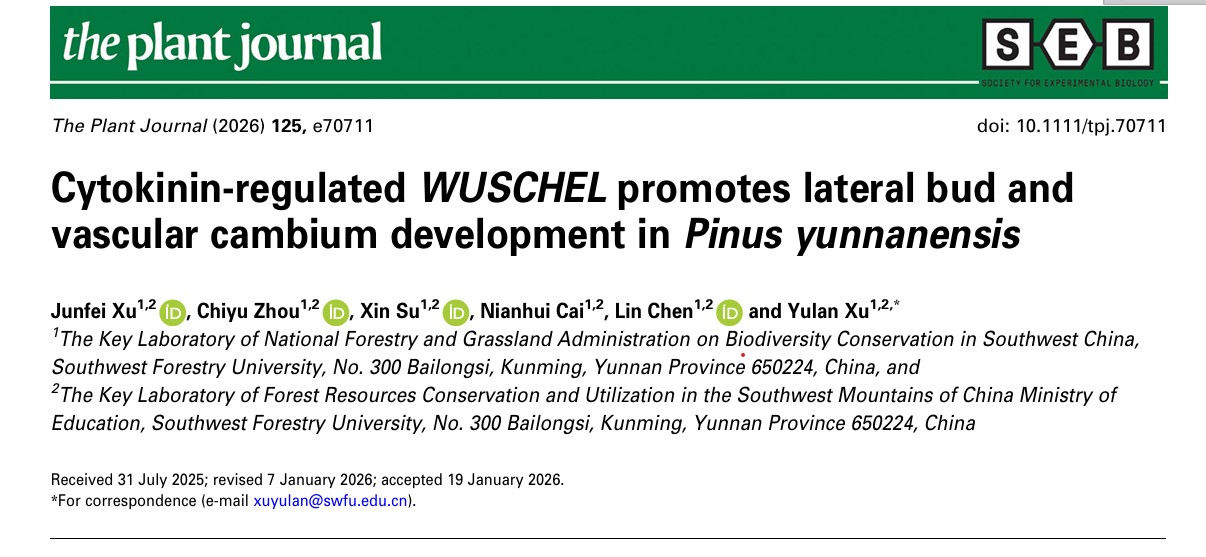 近日,林学院许玉兰教授课题组在植物学国际权威期刊《The Plant Journal》(植物科学1区Top,5年影响因子7.0)在线发表了题为“Cytokinin-regulated WUSCHEL promotes lateral bud and vascular cambium development in Pinus yunnanensis”的研究论文(doi: 10.1111/tpj.70711)。该研究明确了细胞分裂素在云南松侧芽发育中的调控功能,并初步揭示了WUSCHEL(WUS)基因通过调控分生组织活性影响侧芽与维管组织发育的分子机制。林学院许玉兰教授为本论文通讯作者,...