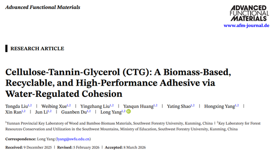 近日,我校材料与化学工程学院杨龙研究员团队在国际顶刊《Advanced Functional Materials》(中国科学院一区TOP,IF: 19.0)上发表题为 “Cellulose-Tannin-Glycerol (CTG): A Biomass-Based, Recyclable, and High-Performance Adhesive via Water-Regulated Cohesion”的研究论文。该论文的第一作者为2024级博士研究生刘同达,杨龙研究员为论文通讯作者。该研究针对生物质胶黏剂胶合性能差以及传统合成树脂胶黏剂可持续性不足的问题,...