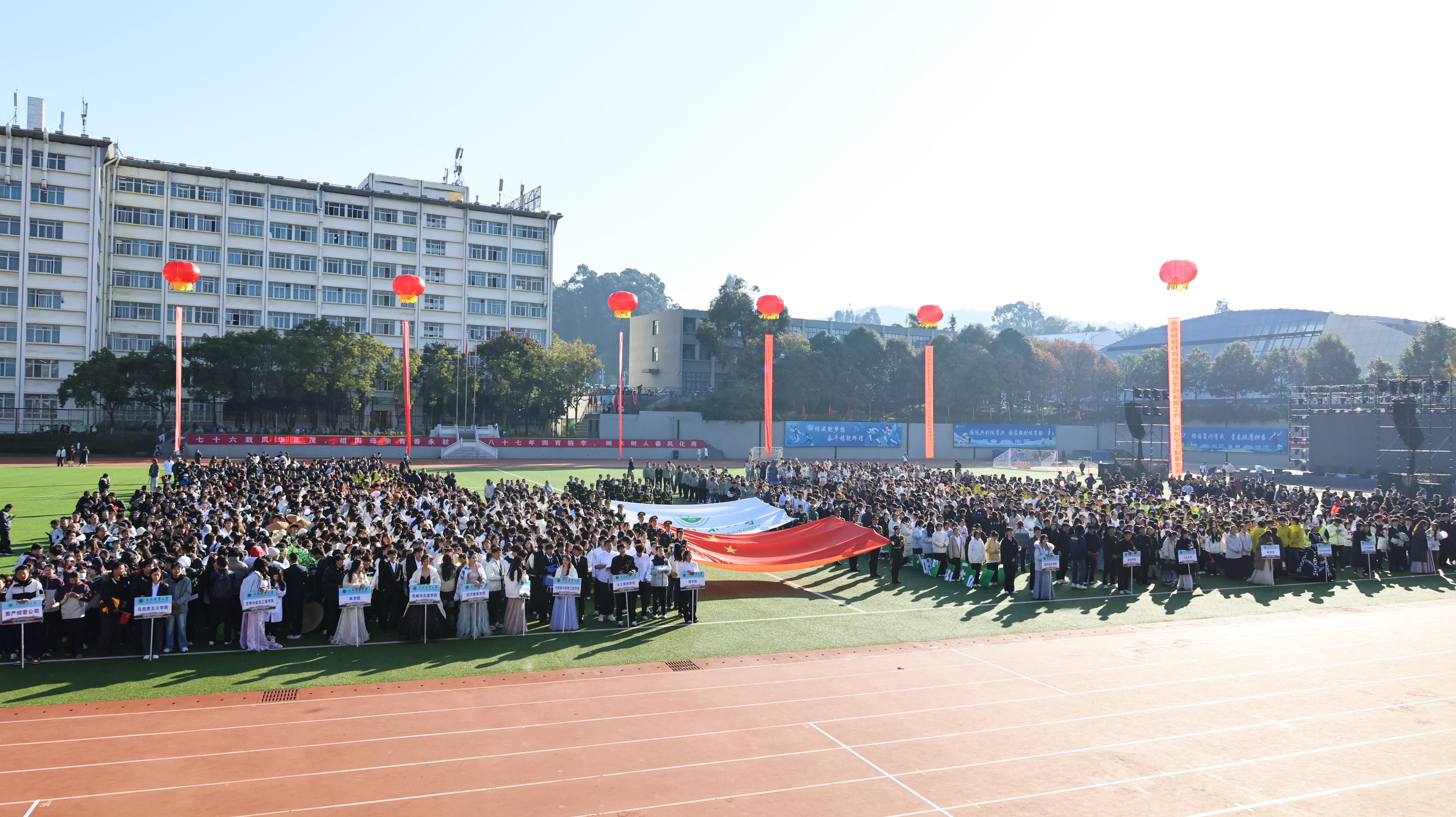 11月26日,西南林业大学第三十五届大学生运动会暨第一届体育艺术文化节在北区足球场开幕。在昆校领导,各院级党组织师生代表及全体运动员参加开幕式。镇康县教育体育局负责同志和部分非遗传承人应邀参加开幕式。开幕式由副校长狄光智主持。开幕式上,国旗方阵、校旗方阵、各院级代表队方阵依次入场,展现出师生饱满的精气神和顽强拼搏的体育精神。校党委书记李永勤宣布运动会开幕,校长李君为运动会开幕致辞,裁判员代表、运动员代表分别宣誓。...