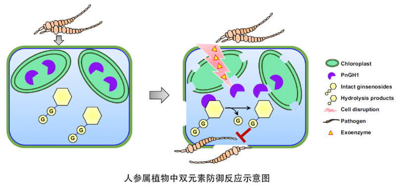 本研究发现,重要药用植物三七中已进化出一种双元素化学防御系统,该系统由定位于叶绿体的β-葡萄糖苷酶(β-glucosidase,PnGH1)及其底物20(S)-原人参二醇人参皂苷(20(S)-protopanaxadiol ginsenosides)组成。生理条件下,β-葡萄糖苷酶及其底物在细胞中是空间分离的;而病理状态下,病原真菌暴露于植物叶片时所分泌的胞外酶破坏了叶绿体的完整性,导致时空性激活人参皂苷的水解反应。启动的水解反应会选择性地切除二醇型皂甘上C-3位点的一个葡萄糖分子,水解产物具有更强效和更广泛的抗植物致病菌活性。此外,本研究发现这种真菌感染时β-葡萄糖苷酶介导的水解机制也存在同属药用植物西洋参(P. quinquefolium)和人参(P. ginseng)中。这些发现为开发植物源性农药提供了重要的启示和研究思路,有望在人参属中药的种植过程中减少对化学农药的依赖,从而为中药研究和中药材的可持续发展作出积极的贡献。