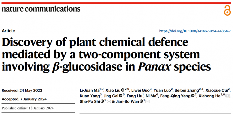 近日,西南林业大学副校长、国家中药材产业技术体系病害防控岗位科学家何霞红教授团队与澳门大学万建波教授、北京中医药大学史社坡研究员合作,在中药三七的植物化学防御领域取得了重要的研究突破。研究成果以“Discovery of plant chemical defence mediated by a two-component system involving β-glucosidase inPanax species” 在Nature子刊《Nature Communications》(IF=16.6)上发表。研究首次发现中药三七植物中存在由葡萄糖苷水解酶介导的双元素植物防御反应,将有助于理解人参属植物如何抵抗病原菌入侵,并为绿色植物源农药的开发提供思路,同时也为药用植物(中药材)活性成分的化学生态学研究提供了一个良好的范例。