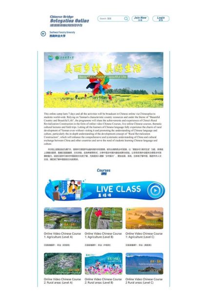2023年7月初,我校申报并成功获批了“美丽乡村 美好生活”汉语桥线上团组项目,成为我校连续第三年获批的项目。此项目为期7天,使用中文联盟平台(Chineseplus)面向海外学员授课,结合云南特色农业、村落文化等,突出云南在“乡村振兴”中取得的成果与经验,以语言交流、文化沟通为媒介,采用线上录播主题课、直播汉语课、专题文化讲座等形式,向世界展现云南的新发展、新面貌,让学员在海外也能感受云南的活力和魅力,促进汉语学习者对中国语言文化的了解,增进中外人文交流,满足其了解中国语言文化的需求。(来源:国际学院/文/图:冯海丹/审核:何新元/初审:李颖/复审:史桓恺/终审:张武先/责任编辑:史桓恺)