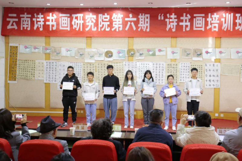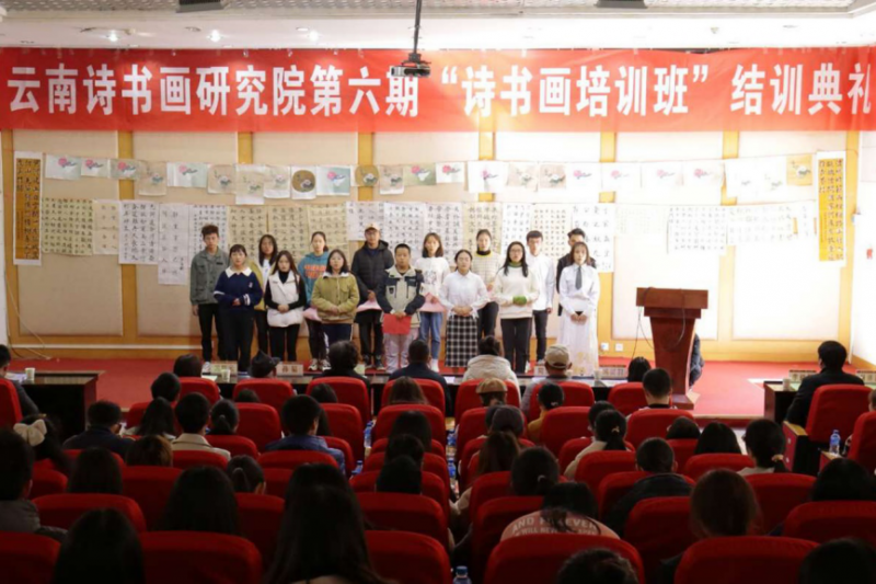 12月25日,云南诗书画研究院第六期“诗书画培训班”结业典礼在图书馆小报告厅举行。校党委副书记、云南诗书画研究院执行院长魏宏,省南社研究会会长李啸云,省南社研究会副会长、云南诗书画研究院执行院长李瑛,省诗词学会副会长兼秘书长、培训班诗词教师周崇文,云南诗书画研究院顾问孙韬,校党委宣传部副部长李福源,艺术博物馆馆长、云南诗书画研究院副院长杨泽雄,省书法家协会会员、青年书法家、培训班书法教师冯雁云,省美术家协会会员、国家一级美术师、培训班绘画教师冯灵羽及培训班学员代表出席结业典礼。