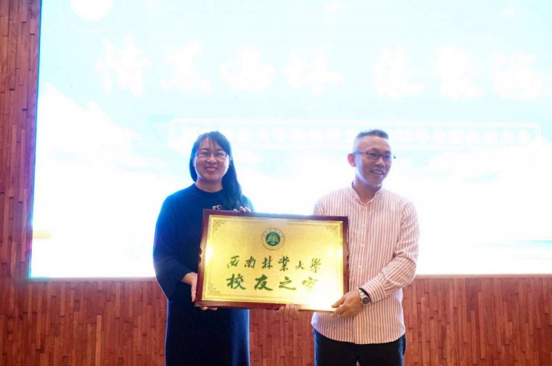 刘清江代表学校向本次年会暨换届大会的召开表示祝贺,对海南校友会四年来开展的工作给予了高度肯定,对各位校友给予母校的支持表示衷心的感谢。刘清江向各位校友介绍了学校近年来的发展情况,期待在未来的日子里,各位校友能继续为母校的发展建言献策,为母校的壮大贡献力量,诚挚邀请大家常回母校看看。校友工作办公室主任向海南校友会共同创建的“心舍”授予“西南林业大学校友之家”牌匾,赠送西南林业大学校友会会旗。