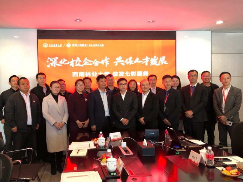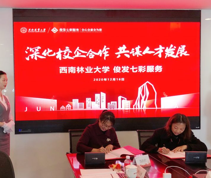 在与会代表的见证下,就业工作处处长张保兰与俊发七彩服务集团人力资源中心总经理朱丽娟共同签署了西南林业大学、俊发七彩服务有限公司校企合作协议。刘清江为俊发七彩服务有限公司授牌。