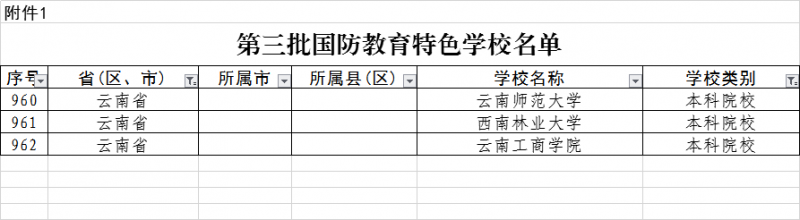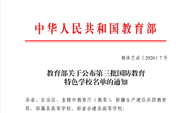 近日,教育部下发了《教育部关于公布第三批国防教育特色学校名单的通知》,教育部综合认定含大中小、职高、中职等在内的1095所学校为第三批国防教育特色学校,其中本科院校59所,云南3所,我校名列其中。