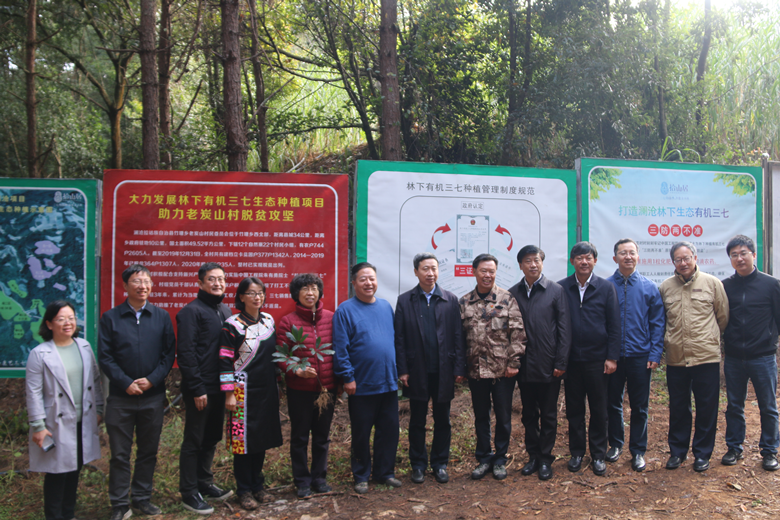 考察组一行先后到澜沧县竹塘乡东主村半坡林下三七种植基地、老炭山村林下三七种植基地和大塘子村林下中药材轮作示范基地进行实地调研。中国工程院挂职澜沧县委常委、副县长刘元昕汇报了在中国工程院院士朱有勇的带领下,澜沧县林下中药材如何一步步发展起来。不仅为脱贫攻坚做出了贡献,更重要的是探索了一条让中药材回归山野林,不占用农田,药效第一的林下有机种植模式。在老炭山基地,种植企业介绍了在朱有勇院士团队的科技支撑下成功实现了林下不用农药不用化肥种植中药材,在带动当地老百姓脱贫的同时更给企业带来了新的生机。在大塘子村中国工程院院士扶贫班学员基地,考察组对林下三七、重楼、黄精、白芨的轮种技术表示高度认可,云南农业大学植物保护学院院长朱书生讲解了林下中药材通过生物多样性原理控制病虫害的机理,利用松树和药材相生相克原理和配套关键技术,不用一滴农药一颗化肥实现林下中药材有机、高品质生产。