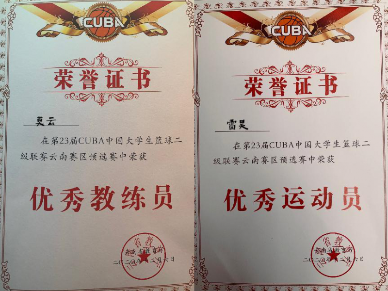 本次比赛由中国大学生体育协会主办,中国大学生篮球分会协办,云南财经大学承办。我校男子篮球队在体育学院领队郭荣、主教练莫云的带领下参加此次比赛。比赛中,我校参赛运动员不畏强敌,勇往直前,经过7天的激烈角逐,最终获得第23届CUBA中国大学生二级篮球联赛云南赛区预选赛季军。这也是我校篮球首次跻身云南前三,具有重要的历史性意义。同时篮球队主教练莫云被评为“优秀教练员”,队员雷昊被评为“优秀运动员”,为学校争得了荣誉。