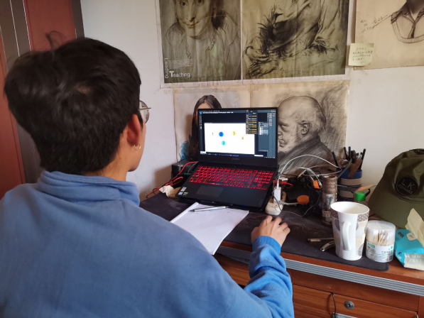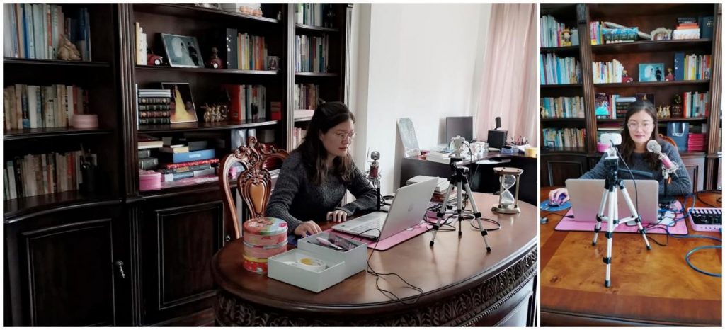 其中,艺术与设计学院王午枫老师为了开展线上教学,购置了专业网络主播使用的动圈麦克风、摄像头和专业话筒放大器。提前和学生进行模拟测试,测试音视频的效果。