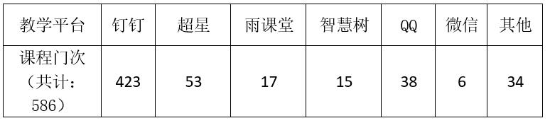 任课教师根据课程特点和要求,师生实际情况,自主选择网络教学平台实施开展线上教学活动。教学平台有钉钉、超星、雨课堂、智慧树、QQ、微信、MOOC、SPOC等,教学方式采用直播、录播、线上指导等多种模式组合。