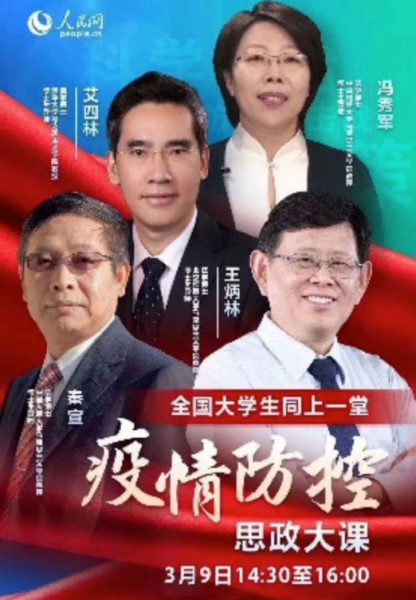 课程中,清华大学马克思主义学院教授艾四林以“在抗击疫情斗争中深化理论认识”为主题;中国人民大学马克思主义学院教授秦宣以“疫情大考告诉我们什么”为主题;北京师范大学马克思主义学院教授王炳以“总结历史经验增强必胜信心”为主题;中央财经大学马克思主义学院教授冯秀军以“战‘疫’里的最美青春——谈中国青年的责任与担当”为主题;四位专家结合抗疫实践,紧密围绕思政课教学内容,从实践、理论、历史以及新时代大学生的责任与担当几个维度解读了党中央对疫情防控的正确决策部署,讲述了抗疫一线的感人故事,深刻阐述了我国这次疫情防控的经验教训、制度优势、团结力量、必胜信心和中国共产党人家国天下、人民利益至上的情怀与诉求。