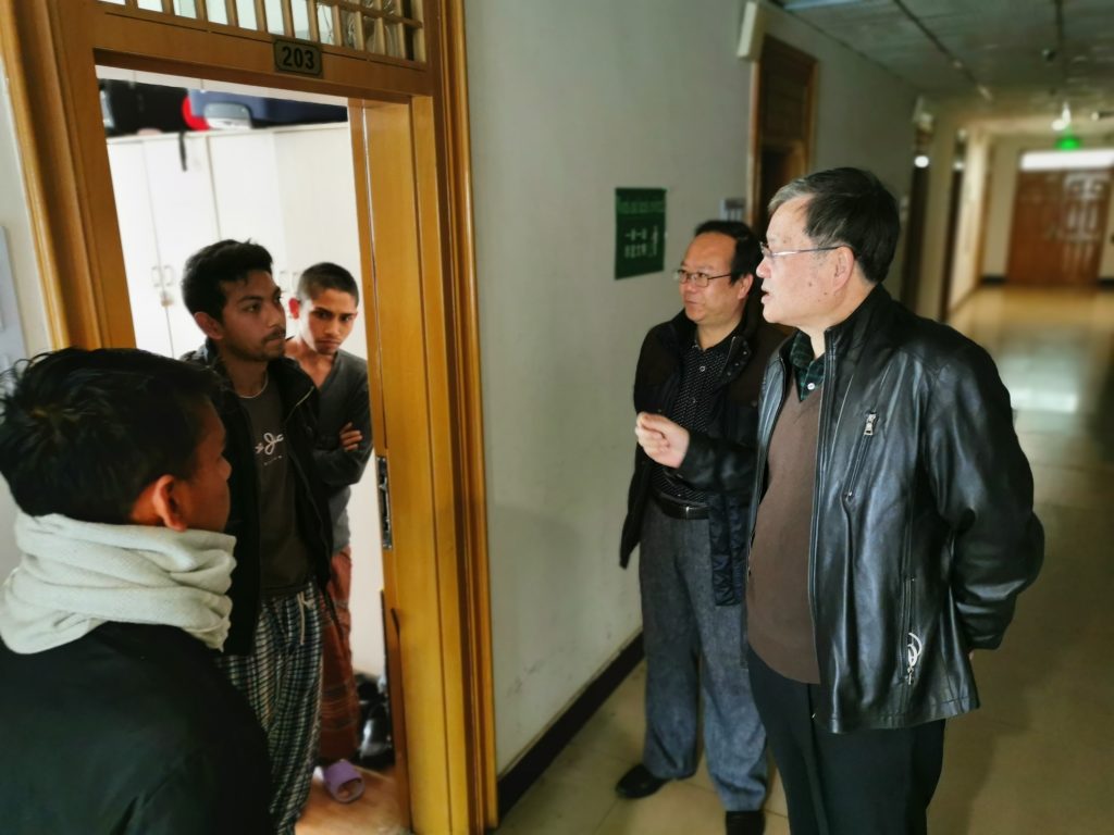1月27日上午,副校长胥辉、国际学院院长及值班教师,一同前往国际学生宿舍,走访、看望全体在校国际学生。胥辉仔细询问了国际学生在学校的生活状况和身体状况,向学生宣传讲解了目前我国新型冠状病毒传染的肺炎疫情及防控措施,同时说明了学校对疫情防控期间在校师生的相关管理规定及要求。他向国际学生们提出,希望大家利用这段时间多看书、多自学,充实地过好每一天。