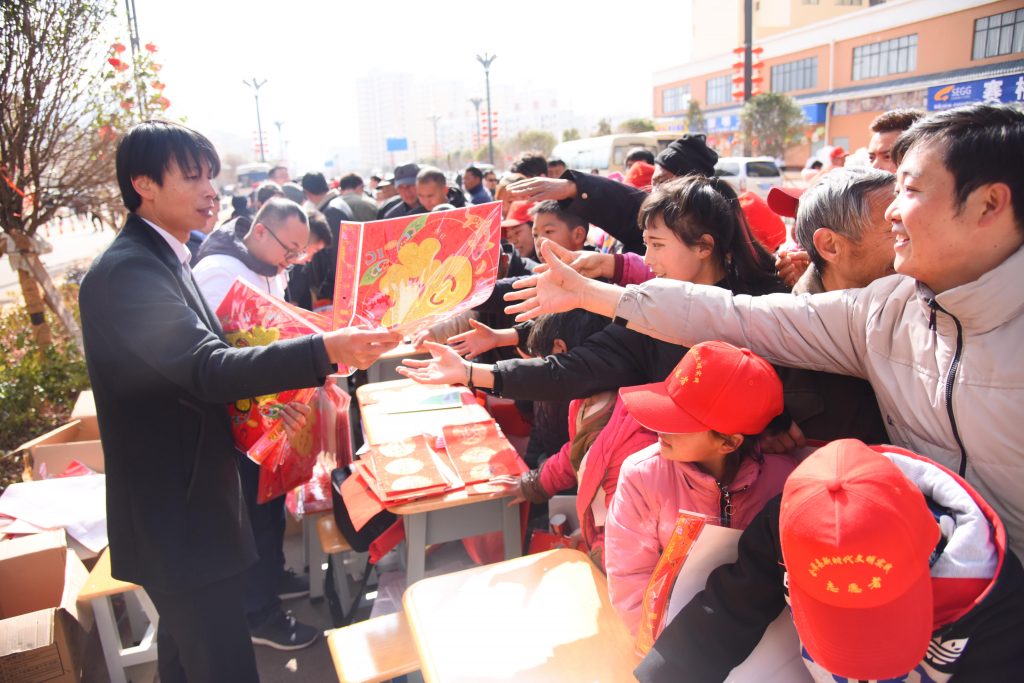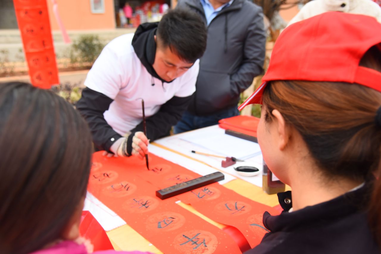 文化服务小分队以喜迎新春佳节为锲机,大力弘扬中华优秀传统文化,发挥学校“红”为底色的特点,现场为当地群众写春联和送“福”。负责写春联的陈瑞黎老师介绍,基于往年下乡的经验,今年在来之前便准备好了200余幅对联,300个“福”,而活动才开始不久,200余幅对联,300个“福”就所剩无几,陈老师所写的对联也是供不应求。“我们写的每一个字都得一笔一划,工工整整,这样的书法才是老百姓最喜欢的。”陈瑞黎说到。
