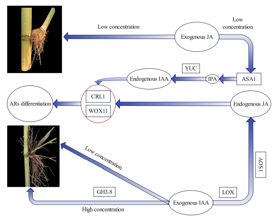 传统的观点认为IAA(吲哚乙酸)在植物不定根分化过程中扮演着重要角色,而茉莉酸及其衍生物是植物体内一类非常重要的脂源性激素信号分子,被称为“损伤激素”或“逆境激素”。它们在植物应对生物和非生物胁迫、调控生长发育的多个方面发挥着核心作用。本研究发现在勃氏甜龙竹枝条基部不定根萌发的过程中,低浓度的茉莉酸对不定根的分化发挥重要的促进作用,揭示了茉莉酸诱导不定根发生的分子机制。茉莉酸合成关键基因DbAOS1和转录因子DbCRL1基因在不定根的分化密切相关,DbAOS1基因既可以单独发挥作用促进不定根分化,也可以通过激活生长素合成途径的ASA1基因发挥作用。DbCRL1基因可与DbWOX11基因互作,协同促进不定根的分化。该研究不仅拓展了对竹子不定根发育的认知,也为茉莉酸的功能研究提供了新视角。
