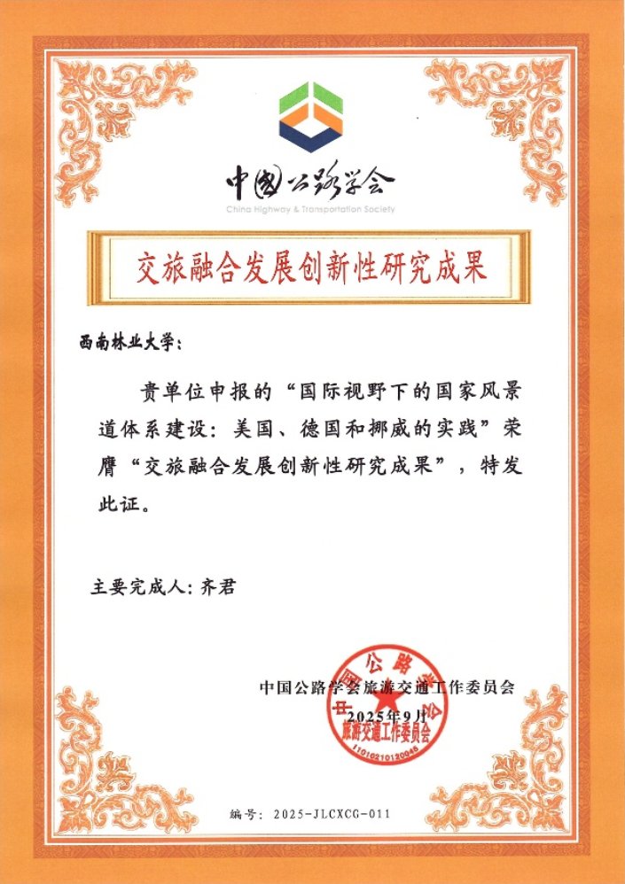 近日,第八届旅游交通大会在湖北宜昌举行,我校园林园艺学院齐君副教授主持完成的学术论文《国际视野下的国家风景道体系建设:美国、德国和挪威的实践》成功入选交旅融合发展创新性研究成果的评选。
