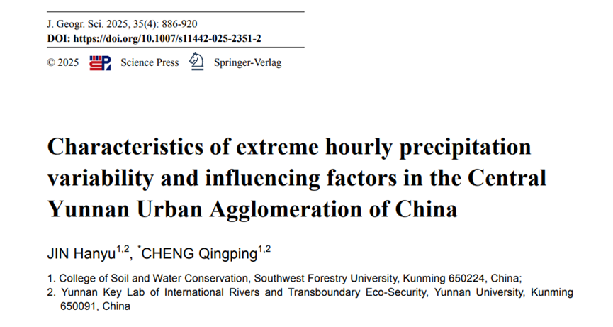 近期,以西南林业大学水土保持学院为第一单位,程清平老师为通讯作者,在领军期刊《Journal of Geographical Sciences》(中国科学院二区,IF2024=5.2)发表题为《Characteristics of extreme hourly precipitation variability and influencing factors in the Central Yunnan Urban Agglomeration of China》的研究论文。该研究通过动态划分城市和乡村站点,并采用线性与非线性回归方法,分析了滇中城市群极端小时降水的演变趋势和驱动因子,为有效识别滇中城市群极端小时降水并减轻其影响提供了新视角。