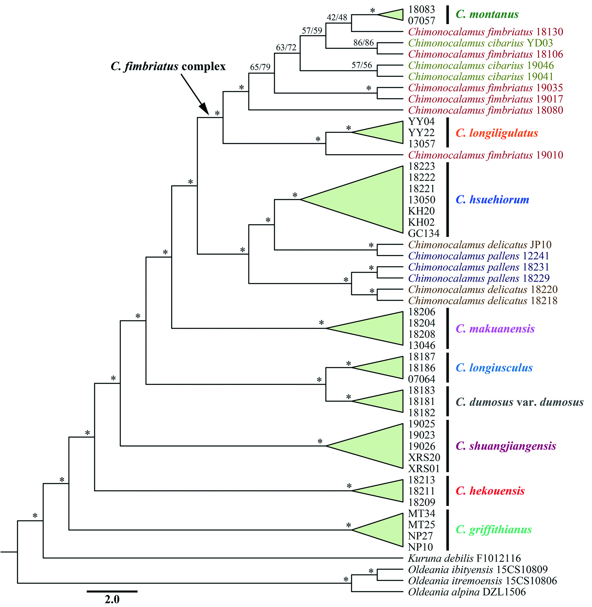 图1基于Skmer分析构建的香竹属系统发育树,该方法与plastome+nrDNA组合具有相同的物种鉴定率。