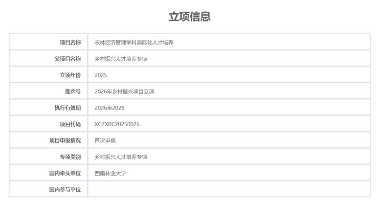 近日,国家留学基金委正式公布2026年乡村振兴人才培养专项资助项目名单,我校申报的“农林经济管理学科国际化人才培养”项目成功入选,成为学校与泰国农业大学、越南国立林业大学合作立项的项目之后,获批的第三个乡村振兴人才培养专项。
