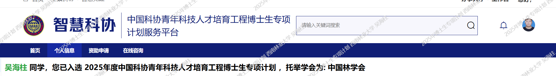 近日,中国科学技术协会公布2025年度“青年科技人才培育工程博士生专项计划”入选名单,我校材料与化学工程学院林业工程学科博士研究生吴海柱成功入选,实现我校在该项目上的零突破。