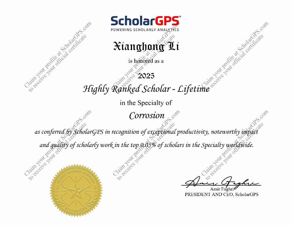 李向红教授致力于缓蚀剂的研究工作,已发表学术论文355篇,其中SCI收录173篇;第一作者或通讯作者发表论文248篇,被SCI收录131篇。H指数为51,曾入选2020-2025(连续六次)全球前2%顶尖科学家、2020-2024(连续五次)中国高被引学者;