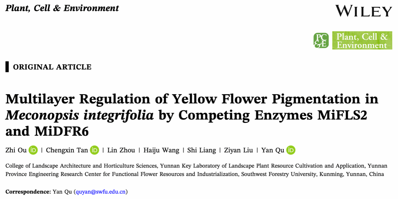 发表在《Plant Cell & Environment》的研究论文题为“Multilayer Regulation of Yellow Flower Pigmentation in Meconopsis integrifolia by Competing Enzymes MiFLS2 and MiDFR6”。该研究由区智副教授、2023级硕士研究生谭成鑫、2025级博士研究生周麟及2021级硕士研究生王海菊担任共同第一作者,屈燕教授为通信作者。研究通过多组学手段深入解析了全缘叶绿绒蒿(Meconopsis integrifolia)黄色花形成的分子调控网络,重点揭示了关键酶之间的底物竞争机制及其对代谢流向的调控作用。
