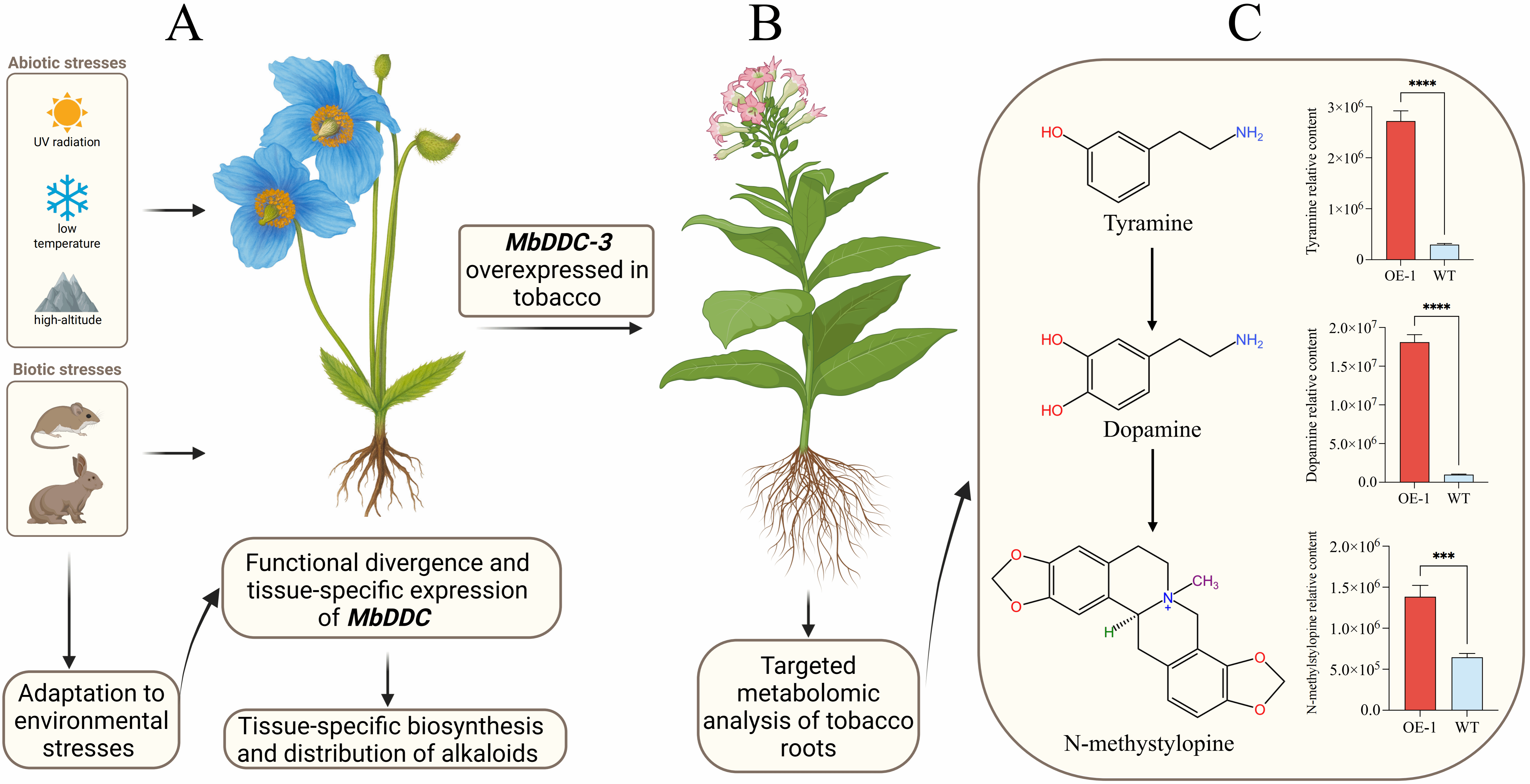 在烟草中过表达MbDDC-3后,根部生物碱含量提高约2.7倍。其前体酪胺与多巴胺的含量同步显著上升,证实了MbDDC-3通过强化前体供给来促进下游异喹啉类生物碱积累的作用。研究推测,MbDDC-3在高海拔环境压力下经历了功能分化,通过在根部富集codeinone、salutaridine等中间体,增强了植物的抗紫外、抗啃食及抗菌能力,是藿香叶绿绒蒿适应极端生态环境的关键进化策略(图2)。该成果首次揭示了绿绒蒿在代谢通路水平的生态适应机制,为高山植物进化与药用成分形成研究提供了关键分子依据。