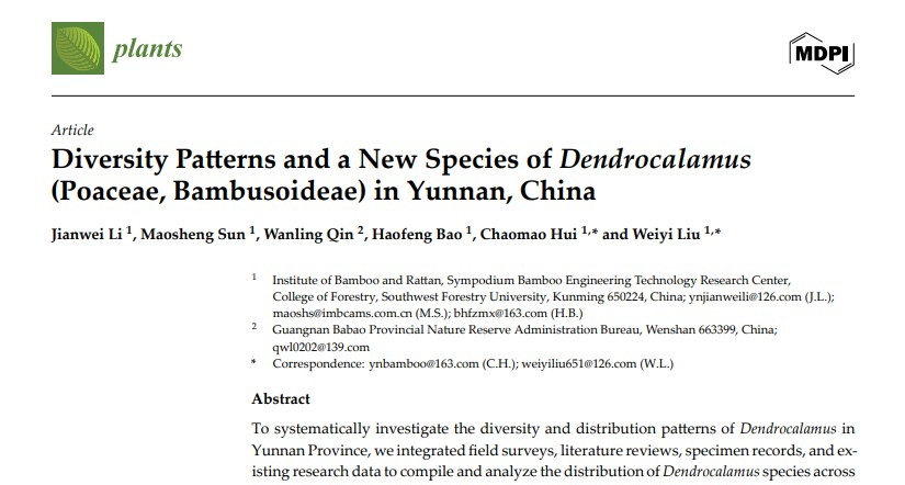 最近,我校竹类研究团队李建伟博士在其博士论文外业调查研究中,在滇西南阿佤山区发现了竹亚科牡竹属三个大型丛生竹类新种——黑毛龙竹、灰白龙竹和鼓节龙竹,分别发表于国际植物分类学权威刊物《Phytotaxa》2026年第744期、《PhytoKeys》2025年第263期和《Plants》2025年第14期。