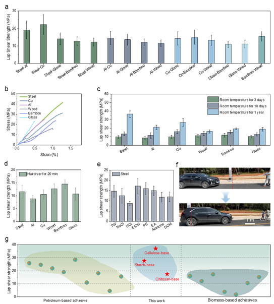 本研究创新性地以农、林、渔业生物质为原料,通过调控粘合剂内部自由水与结合水的比例,实现了对内聚力的优化控制,成功开发出一种全生物质粘合剂。该粘合剂突破性地克服了传统生物质粘合剂强度低、耐水性差以及石油基粘合剂难降解、难回收的瓶颈,集成了室温/加热双固化模式、多基材粘接适配性、超强粘接性能、极端环境耐受性、pH调控可回收性及完全生物降解性等多重优势。其性能媲美甚至超越传统石油基粘合剂,同时具备原料可替代、成本低、环境友好等显著特点,为开发兼具高性能与可持续性的绿色粘合剂提供了全新的设计策略和重要的工业化潜力。