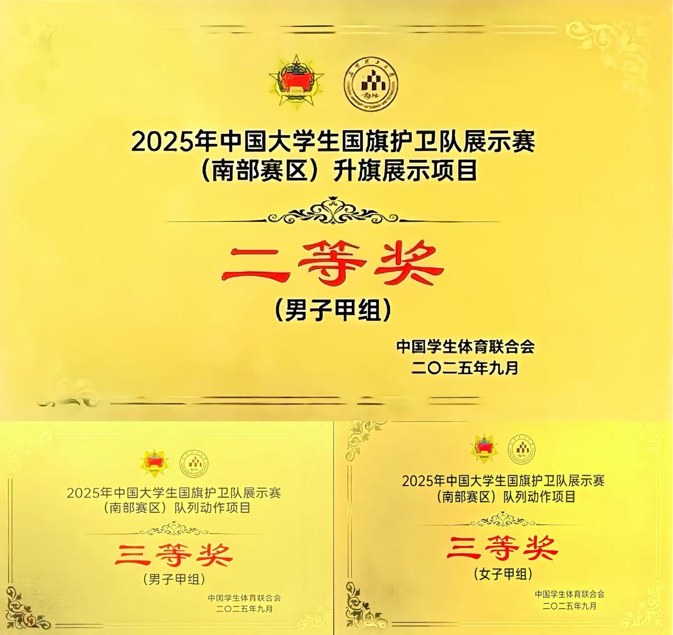 近日,2025年中国大学生国旗护卫队展示赛(南部赛区)在昆明理工大学圆满落幕。我校国旗护卫队选派32名队员参赛,荣获男子甲组升旗展示二等奖、男子甲组队列展示三等奖,以及女子甲组队列展示三等奖。