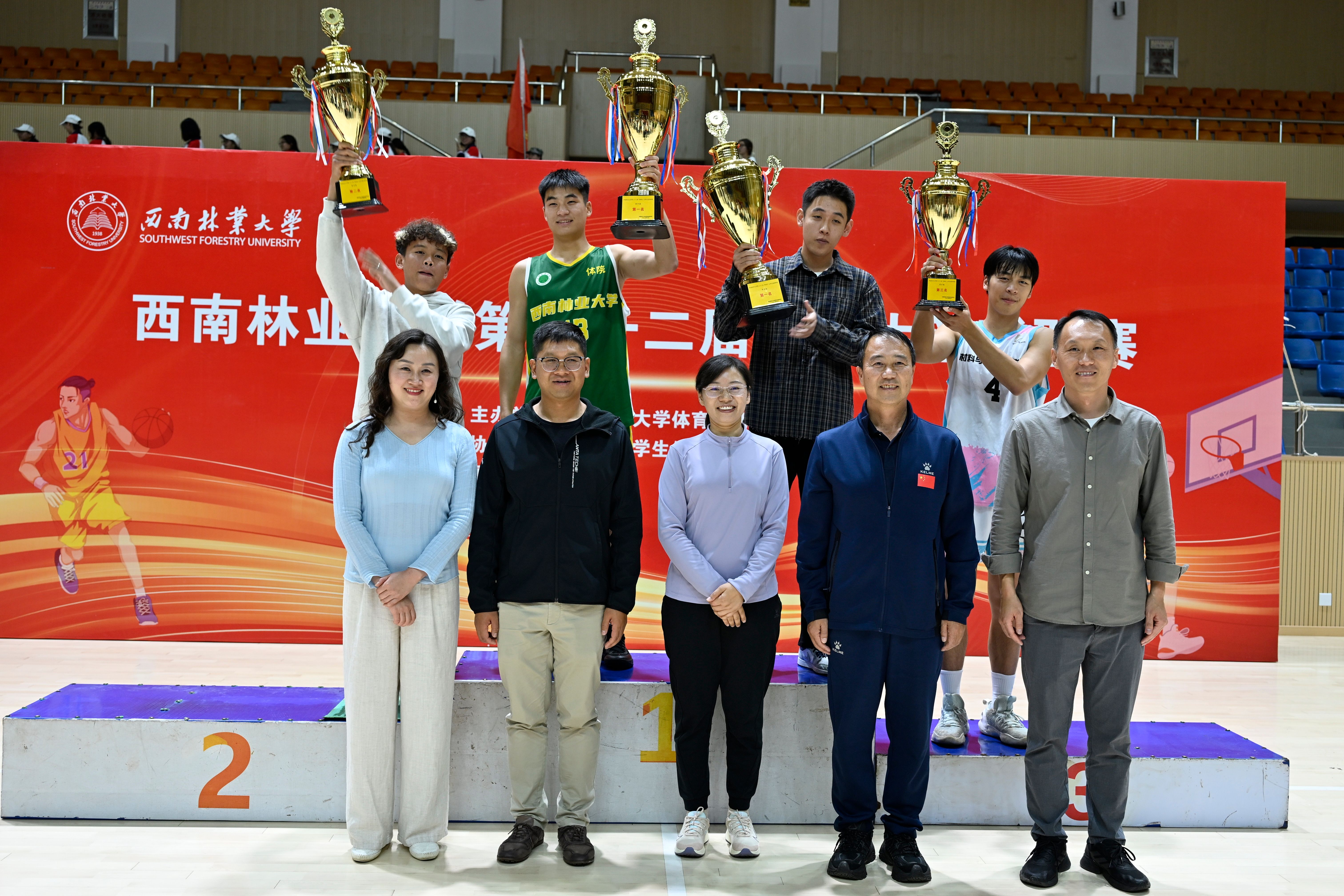 10月13日,西南林业大学第二十二届大学生篮球联赛在体育馆落下帷幕。校党委委员、副校长狄光智,校团委书记王长祺、学生处副处长宋琳、体育学院院长冯强、体育学院副院长陈涛等现场观看体育学院vs公体全明星联队篮球赛,并参加颁奖典礼。