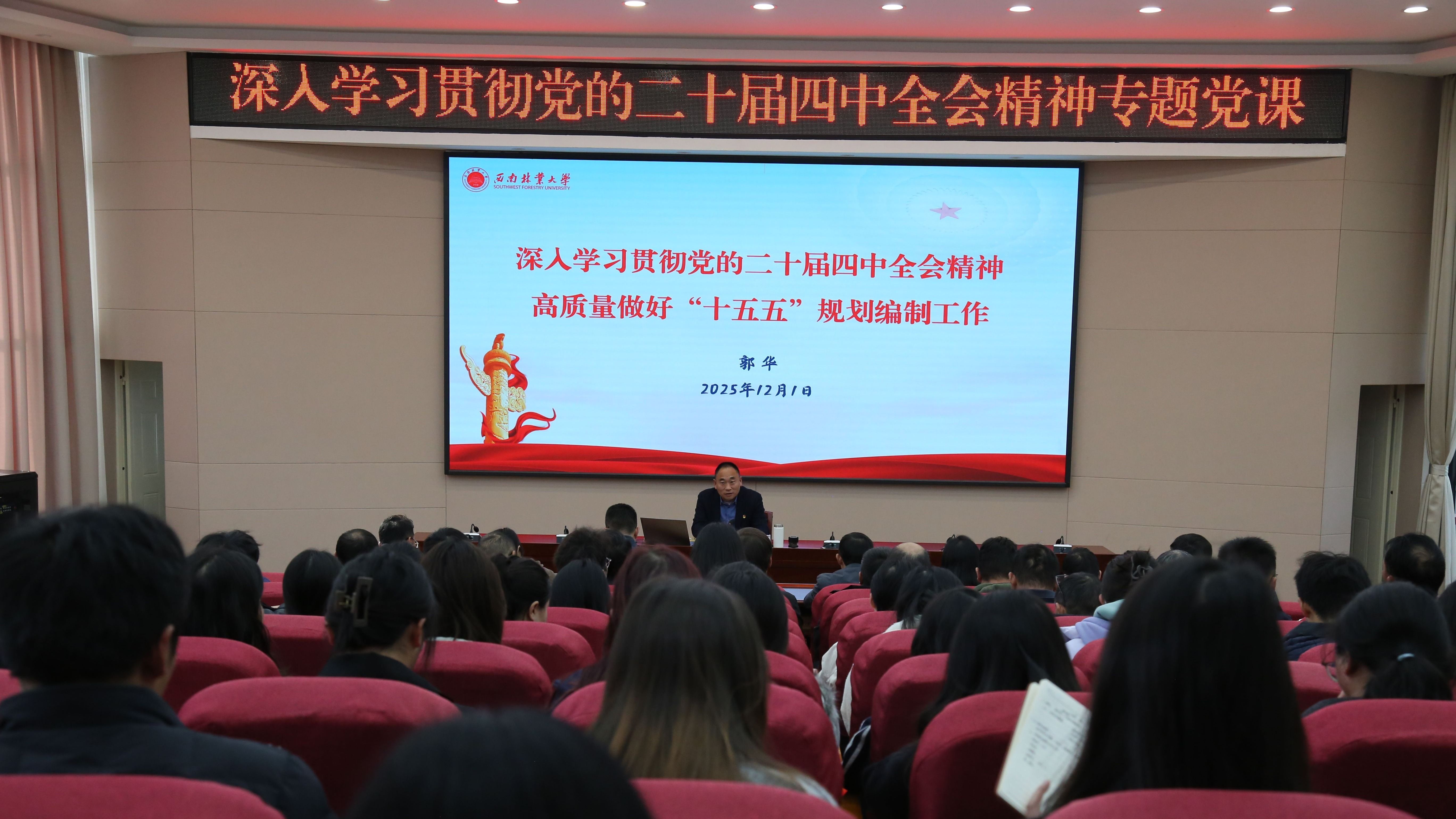 郭华围绕深刻认识党的二十届四中全会的重大意义、把握“十五五”规划建议的主要内容和科学谋划“十五五”事业规划的编制工作,结合市场经济发展、高校教育发展和师生所关切的问题进行讲解。他强调,党的二十届四中全会为我国未来的发展指明了方向,不仅要深入领会全会精神,更要将其融入教育教学、科研创新以及人才培养的各个环节中。他鼓励师生党员积极关注市场经济发展动态,将个人成长与国家发展紧密结合起来,为实现中华民族伟大复兴的中国梦贡献自己的力量。