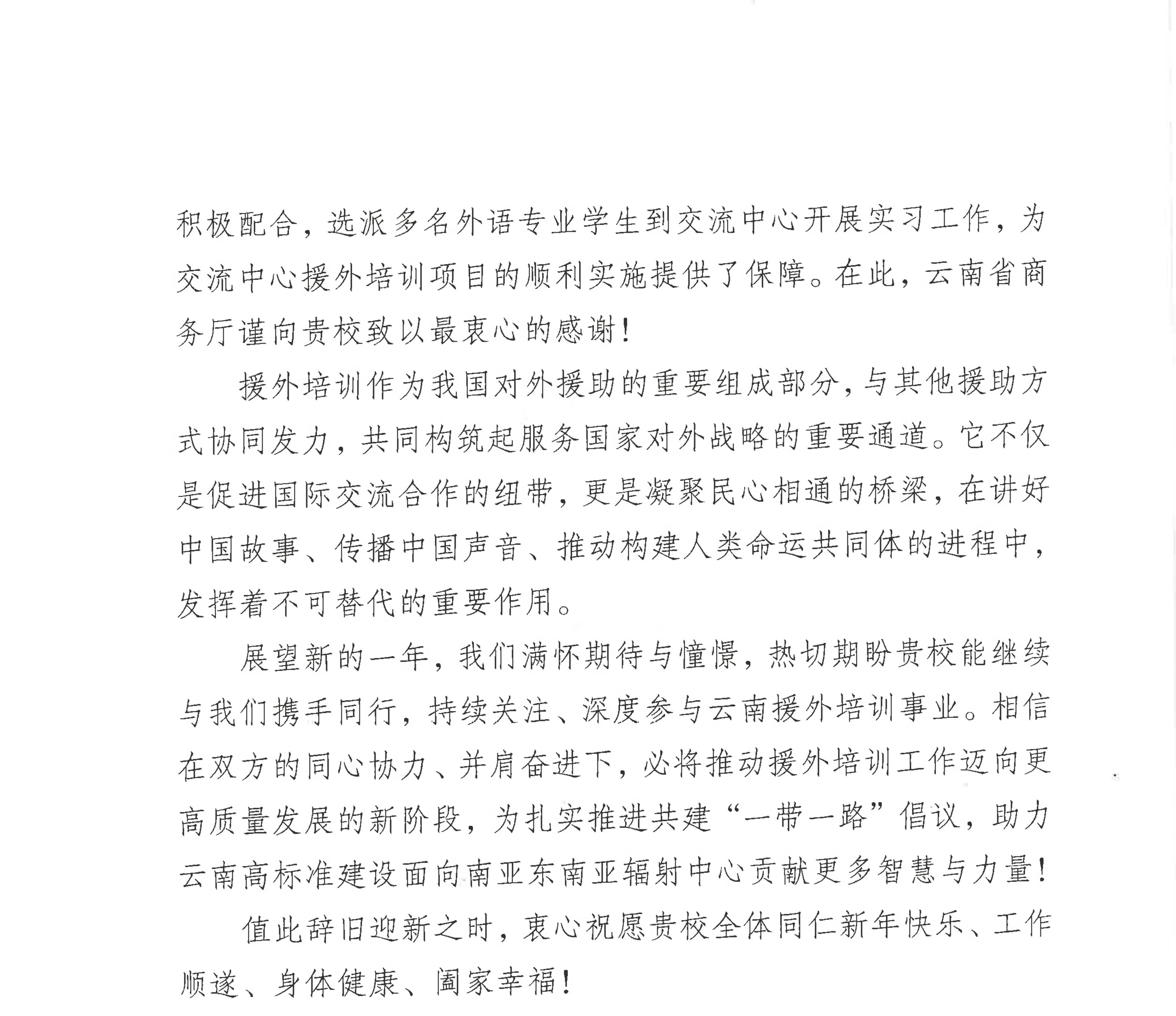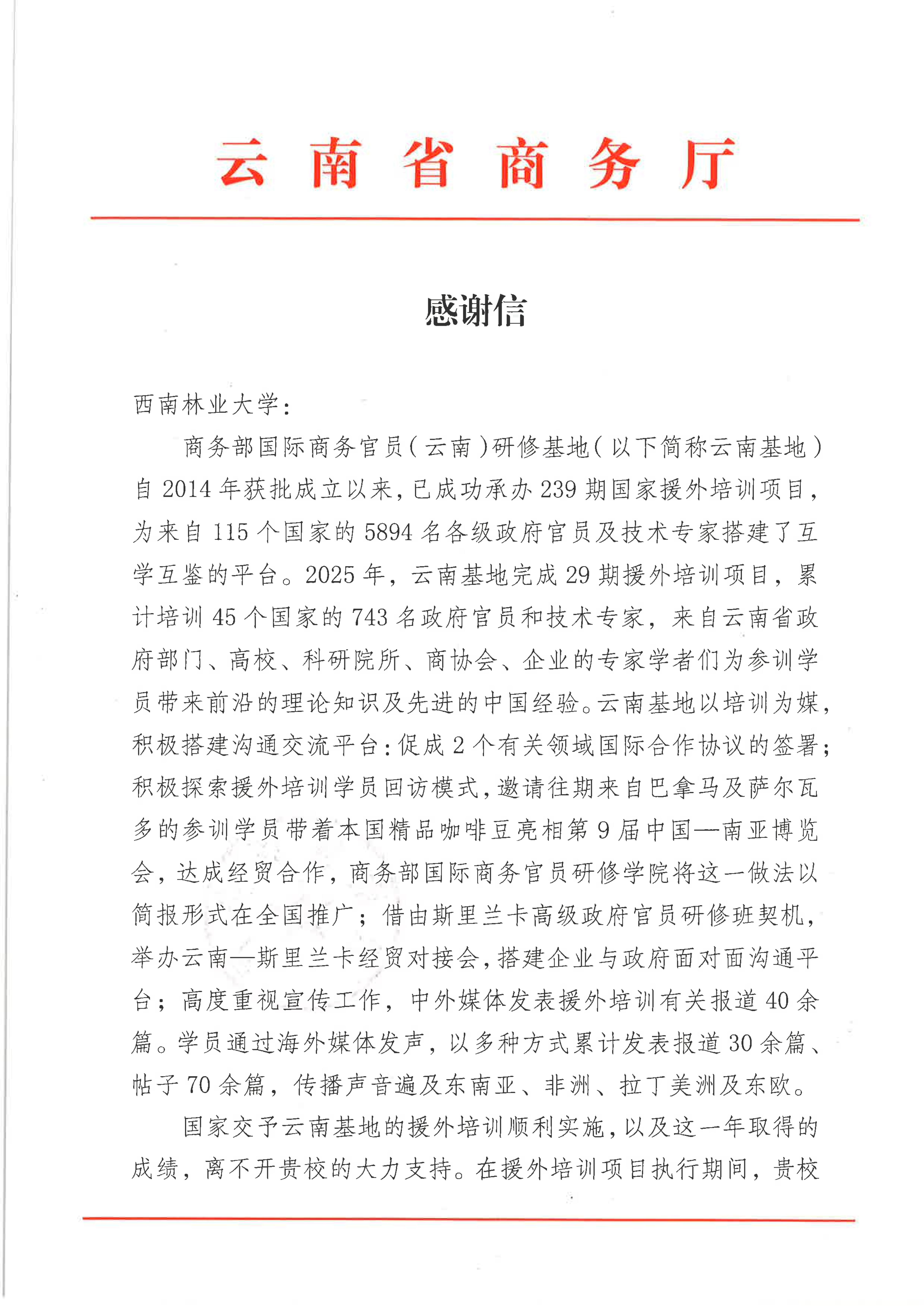 近日,云南省商务厅向西南林业大学发来感谢信,对我校外国语学院(国际学院)在商务部国际商务官员(云南)研修基地援外培训工作中的大力支持致以诚挚谢意。多年来,云南基地以培训为桥,搭建起中外互学互鉴的重要平台,西南林业大学外国语(国际学院)选派多名外语专业学生到交流中心开展实习工作,为交流中心援外培训项目的顺利实施提供了保障。
