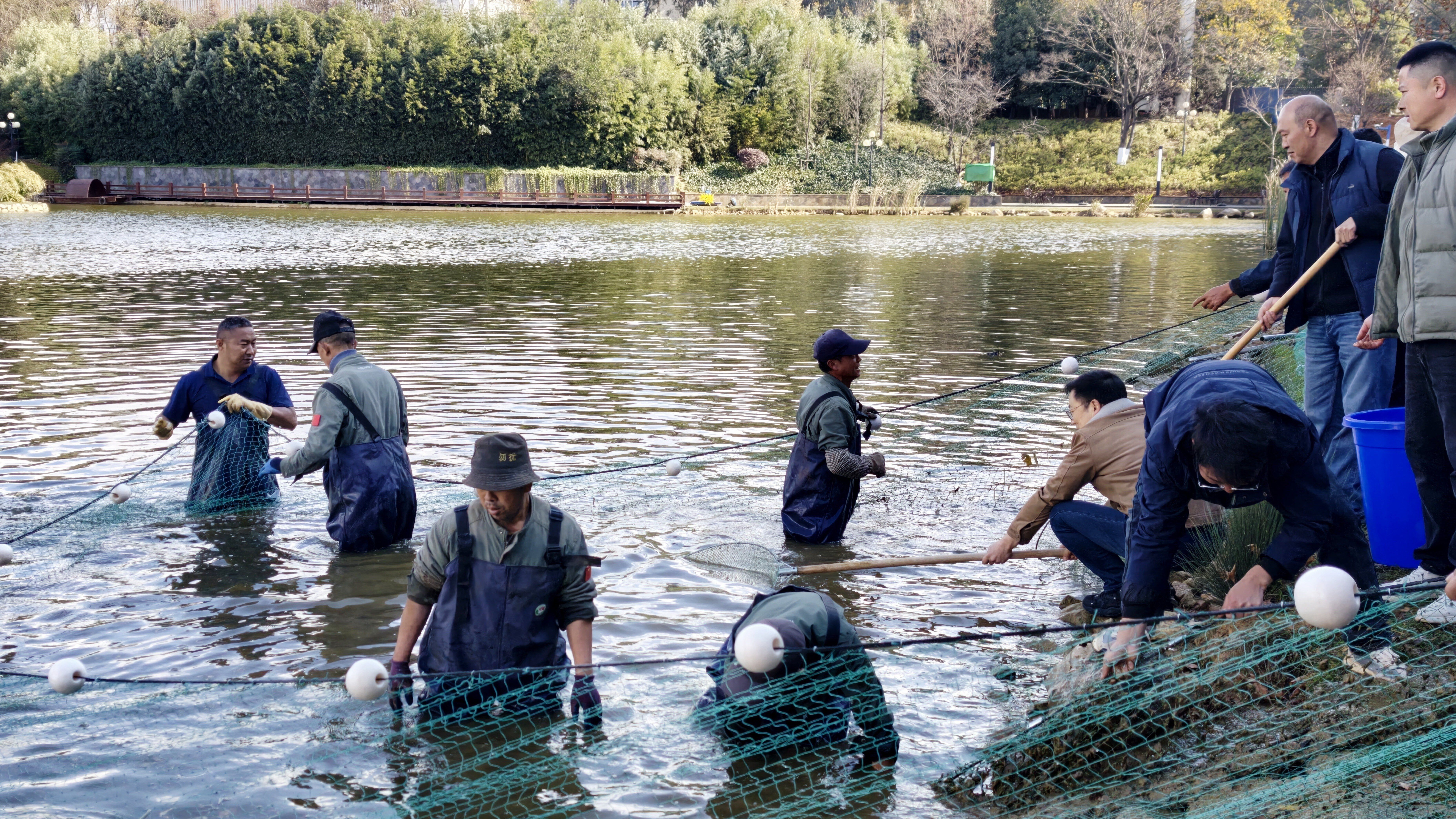 自今年初投放鱼苗以来,公司持续开展西林湖常态化管护与水体治理,生态品质稳步提升,鱼类生长态势良好。本次捕捞严格执行操作规范,公司职工不畏严寒,协同作业,共捕获鲜鱼约800公斤。经各个食堂精心烹制后,向全校师生免费供应。