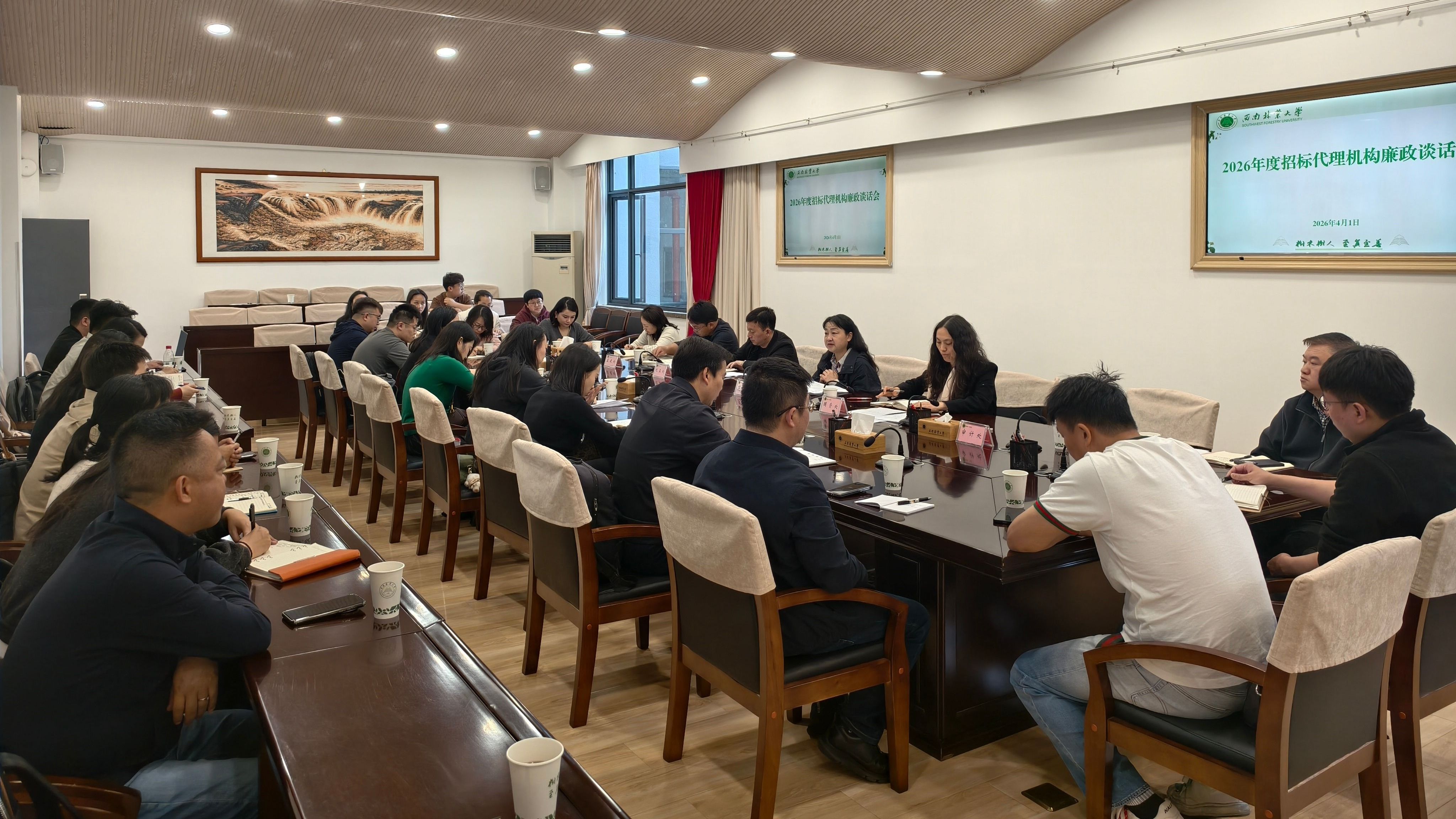 4月1日,西南林业大学组织召开2026年度招标代理机构廉政谈话会,副校长范丽仙出席会议并讲话。会议由学校招投标管理领导小组办公室主任、国资处处长李红英主持。