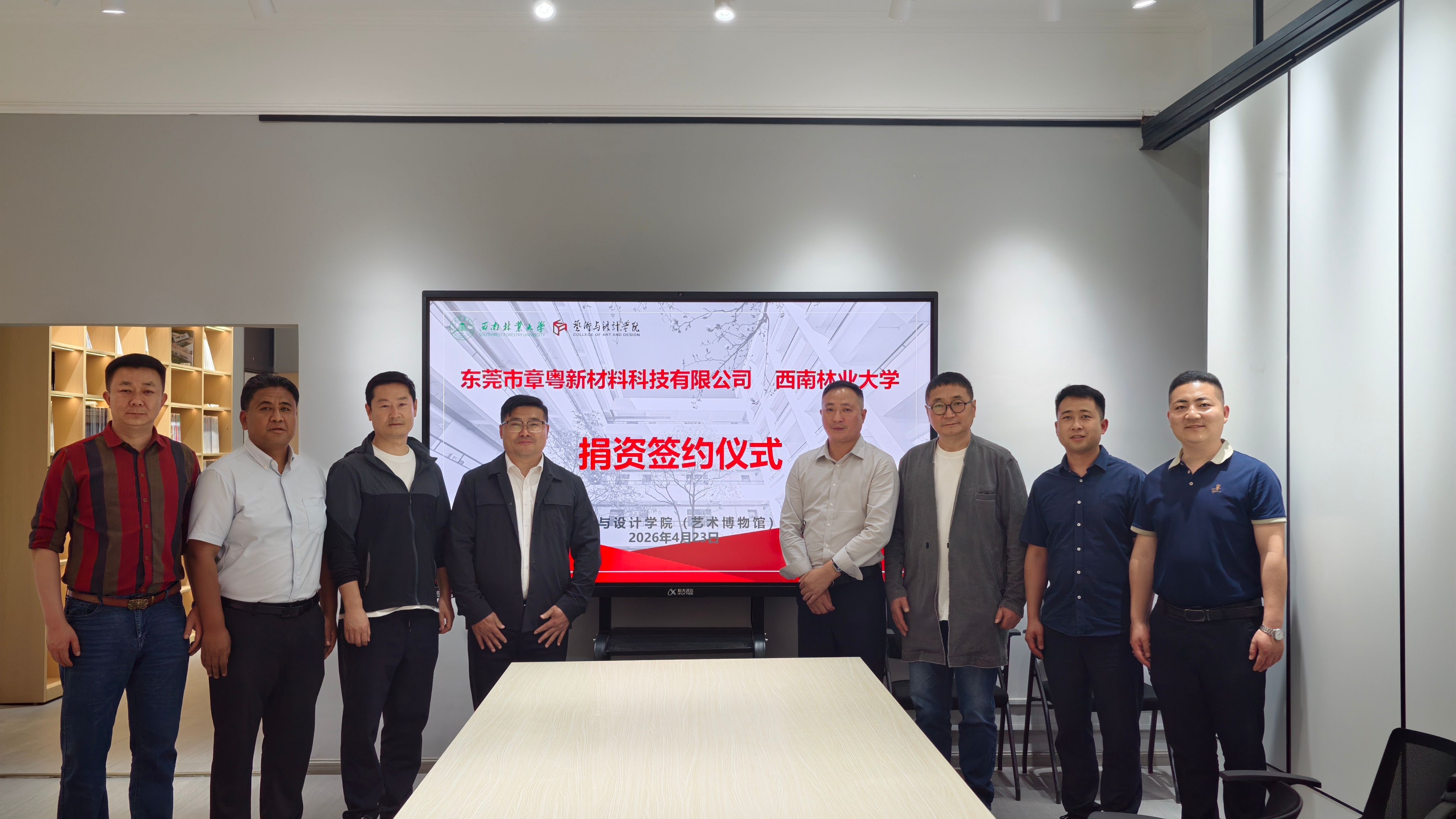 4月23日,东莞市章粤新材料科技有限公司与西南林业大学捐资签约仪式在设计楼隆重举行。东莞市章粤新材料科技有限公司总经理张德波,艺术与设计学院党委书记张德国、院长李生森及学院党政领导、团学负责人出席仪式。