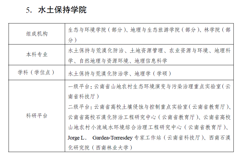 学院开设有水土保持与荒漠化防治、农业资源与环境、地理科学、地理信息科学、自然地理与资源环境、土地资源管理6个本科专业,其中水土保持与荒漠化防治为国家“双万计划”一流专业建设点、教育部特色专业,云南省重点建设专业和云南省一流专业,分别于2000、2007和2014年开始本科、硕士和博士研究生招生,已形成完整的本、硕、博人才培养体系。先后主编国家林草局十二五、十三五和十四五规划教材13部,获云南省优秀教材2部。拥有水土保持与荒漠化防治学云南省高等院校教学团队和云南省实验教学示范中心,云南省山地农村生态环境演变与污染治理重点实验室、云南省高校土壤侵蚀与控制重点实验室、云南省高校山地农村小流域水环境综合治理工程研究中心、云南省石漠化防治工程研究中心、山地农村清洁小流域建设省创新团队以及石漠化研究院、水土保持研究所等省、厅级平台团队10余个。先后获得6项省科学技术二等奖。近五年,主持国家和云南省重点研发计划等重要科研项目30余项,科研总经费达5000余万元。同时学院高质量开展水土保持政府咨询和社会服务。1项政府咨询报告获云南省委书记批示。长期开展云南省水土保持监测人员技术培训,制订的《云南省水土保持监测站点建设及监测技术标准》指导云南省水土保持监测站点的建设和运行管理工作,为云南省水土保持监测工作成为全国典范提供了科技支撑。