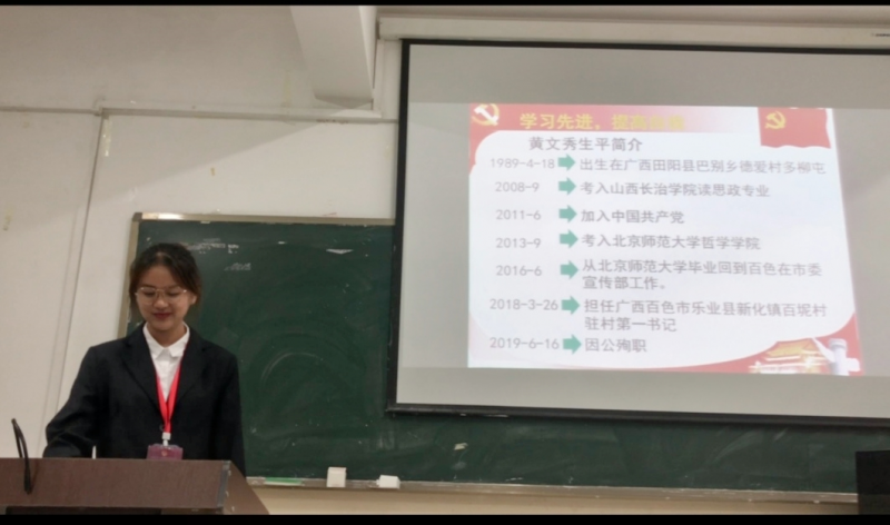 陈思睿同学给大家分享了时代楷模黄文秀的先进事迹,她讲述了这位女英雄研究生毕业后放弃了大城市的工作机会,响应组织的号召,毅然回到百色市,担任乐业县新化镇百坭村担任驻村第一书记,投身脱贫攻坚事业,用自己的生命诠释了必须打赢脱贫攻坚的使命与担当。作为当代大学生,应从英雄楷模的先进事迹中汲取精神力量,鼓舞士气斗志,不忘初心、牢记使命,勇于担当、甘于奉献,在新时代的长征路上做出新的更大贡献。