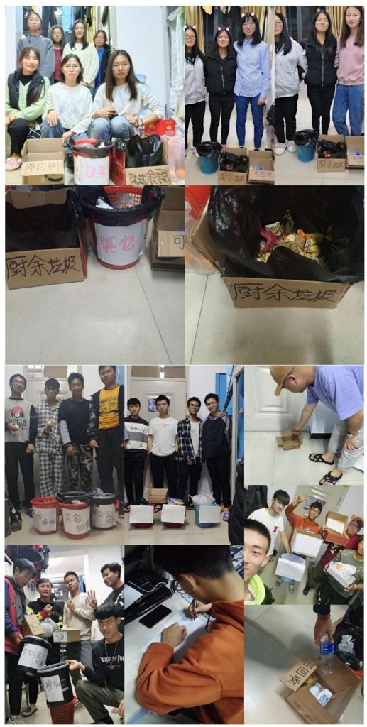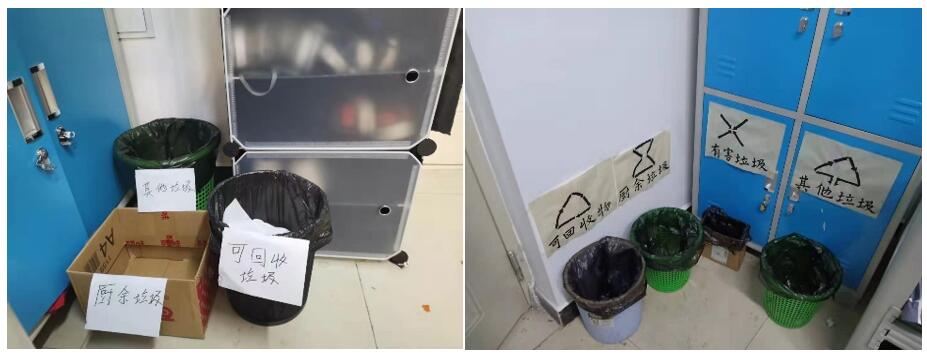 各宿舍建立垃圾分类角,对宿舍产生的垃圾进行分类投放,从宿舍做起,逐步推广。