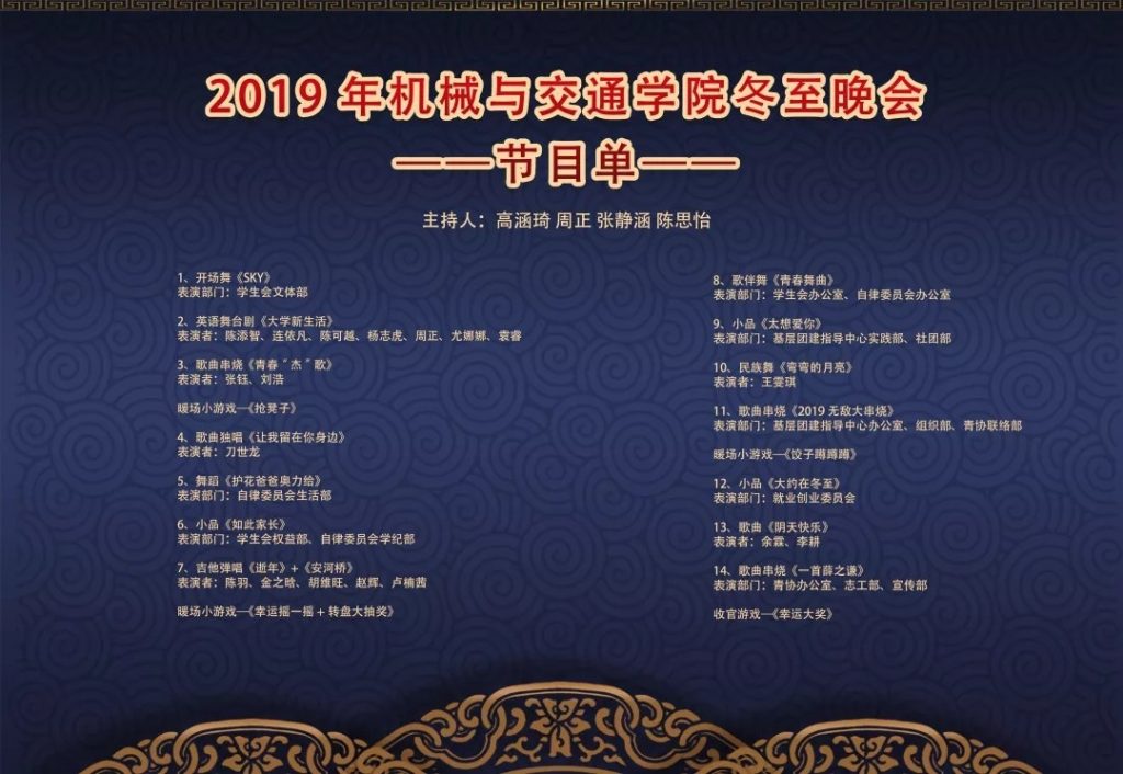 2019年12月22日晚7:00,机械与交通学院在大学生活动中心举办了冬至晚会。以此加强同学之间的凝聚力,丰富校园文化生活,表达对同学和老师们的关怀与问候,让老师和同学齐聚一堂,在欢快温馨的氛围中总结过去,展望未来,共迎新春。