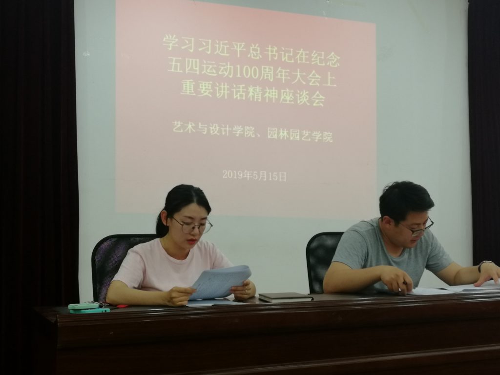 为认真贯彻落实习近平新时代中国特色社会主义思想,传承与发扬五四精神,艺术与设计学院联合园林学院于5月15日开展学习习近平总书记在纪念五四运动100周年大会上的重要讲话精神座谈会,座谈会由艺术与设计学院团委老师安冬妮主持,各班团支部书记及学生代表参加座谈会。