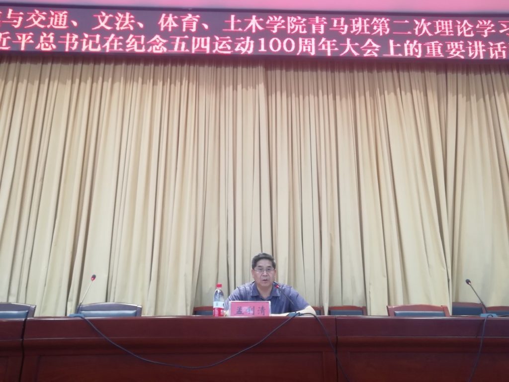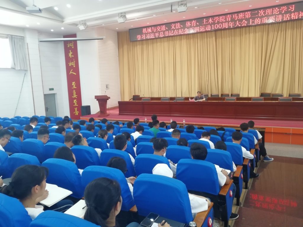 2019年4月,由文法学院、体育学院、土木工程学院、机械与交通学院联合举办的青马班正式启动。为引领四个学院的青马学员志存高远,勇立时代潮头,争做时代先锋。2019年5月17日,机械与交通学院党委书记孟利清为青马班上了以“习近平总书记在纪念‘五四’运动100周年大会上的重要讲话精神”为主题的理论课。