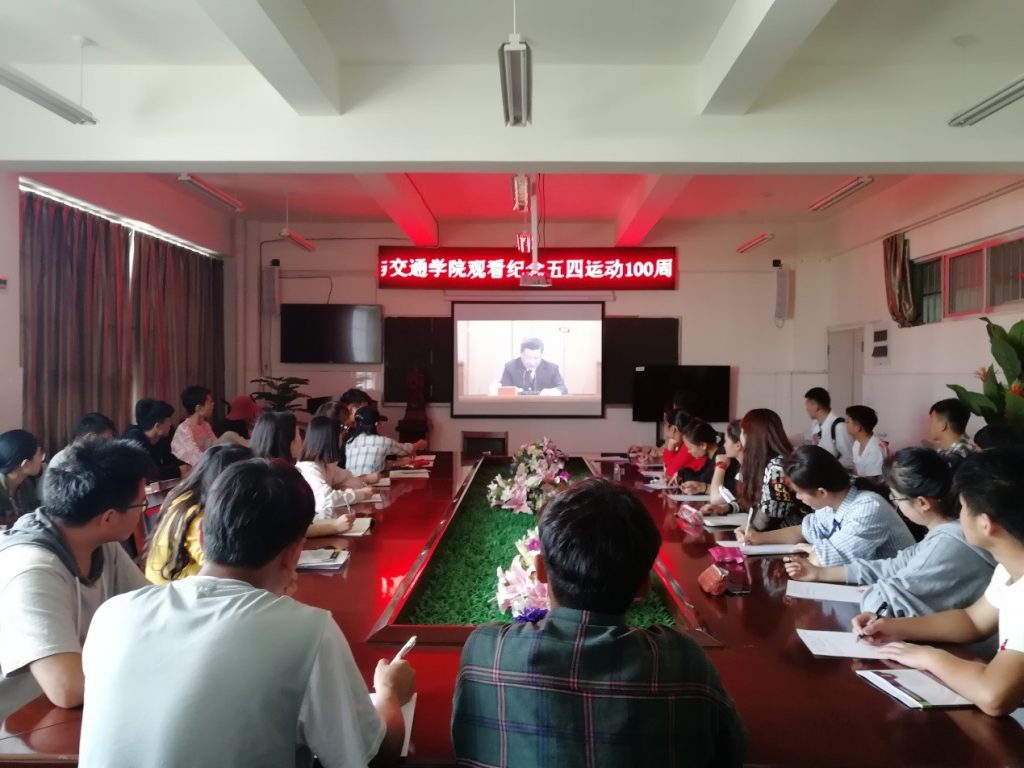 机械与交通学院以2019 年4 月30 日上午10 点30 分在人民大会堂举行的纪念五四运动100 周年大会为契机,在经管楼313会议室开设分会场,以集中收看的形式组织50名学生团干部收看直播,并要求学院33个团支部1686名青年学生利用课余时间,采用集中或分散的形式,在教室、宿舍、课间、操场等多场合多形式收看大会视频直播,认真学习习近平总书记在大会上的重要讲话。做到学院团员全面覆盖,支部群众积极靠拢,研讨交流反响强烈。收看结束,同学们进行了激烈的讨论。来自交通运输2017级的洪笑晓同学认为:作为新一代的青年,我们应该有初生牛犊不怕虎的精神,勇于前行,勇于创新,敢于奋斗,敢于担当,做劈波斩浪的勇者,披荆斩棘的强者。来自汽车服务工程2017级的闫永增同学认为:五四精神是:“爱国、民主、进步、科学”,其核心是爱国主义。青年是最富有朝气,最富有梦想的。我们要发扬伟大五四精神,高举爱国主义旗帜,以社会主义建设者和接班人的使命担当,树立远大理想,为全面建成小康社会,全面建设社会主义现代化而努力奋斗,为实现中华民族伟大复兴的中国梦贡献自己的青春力量。